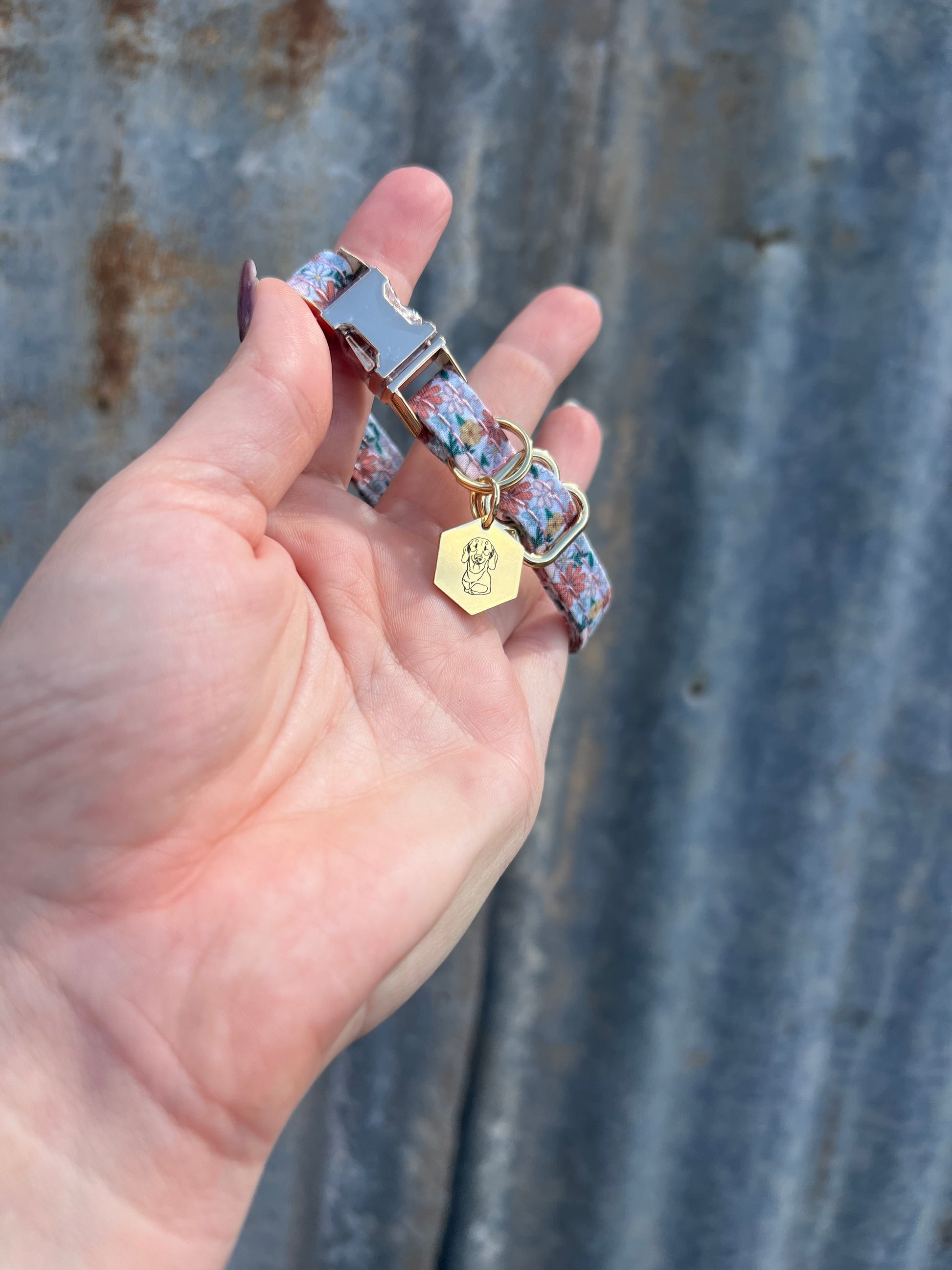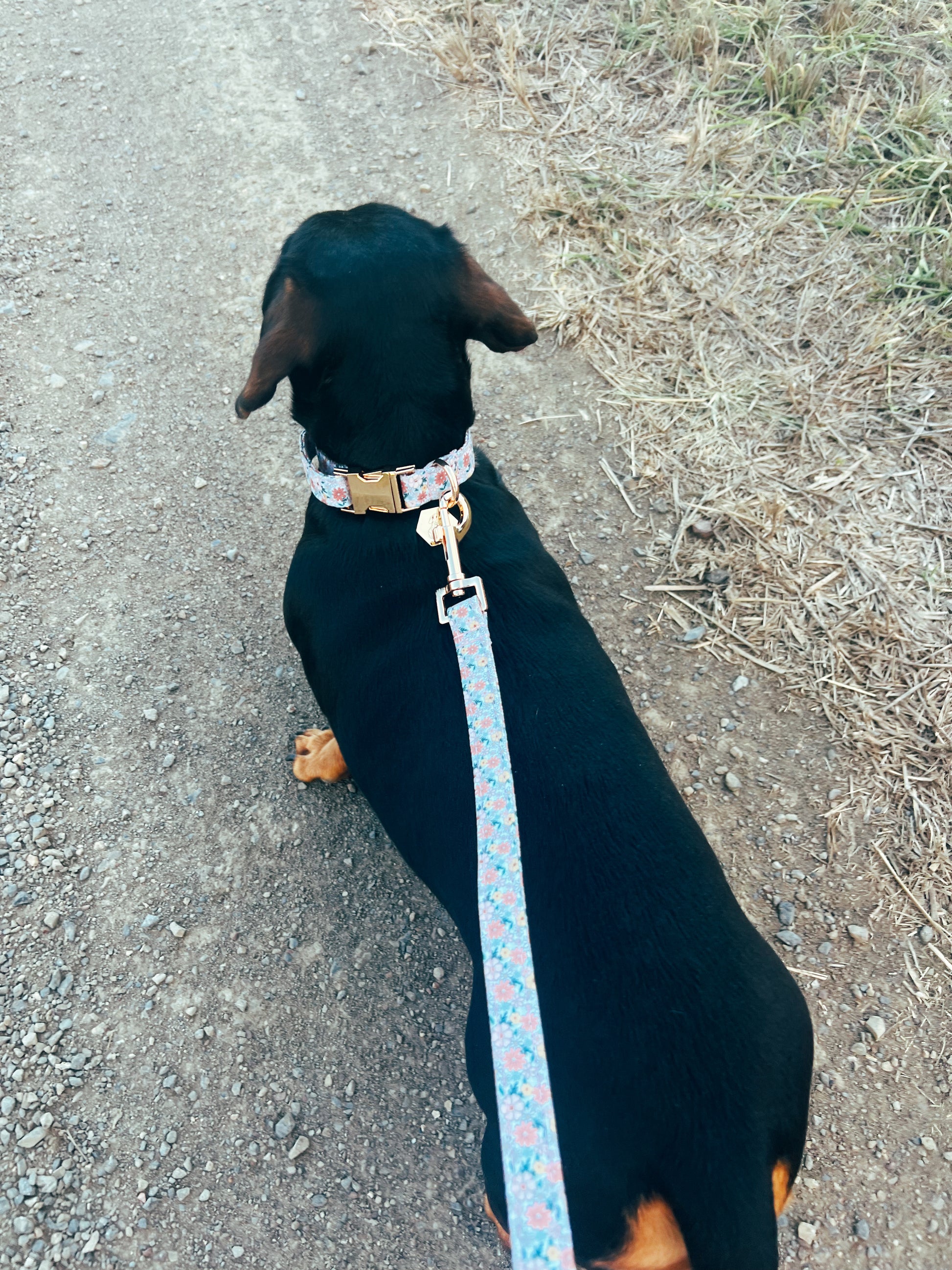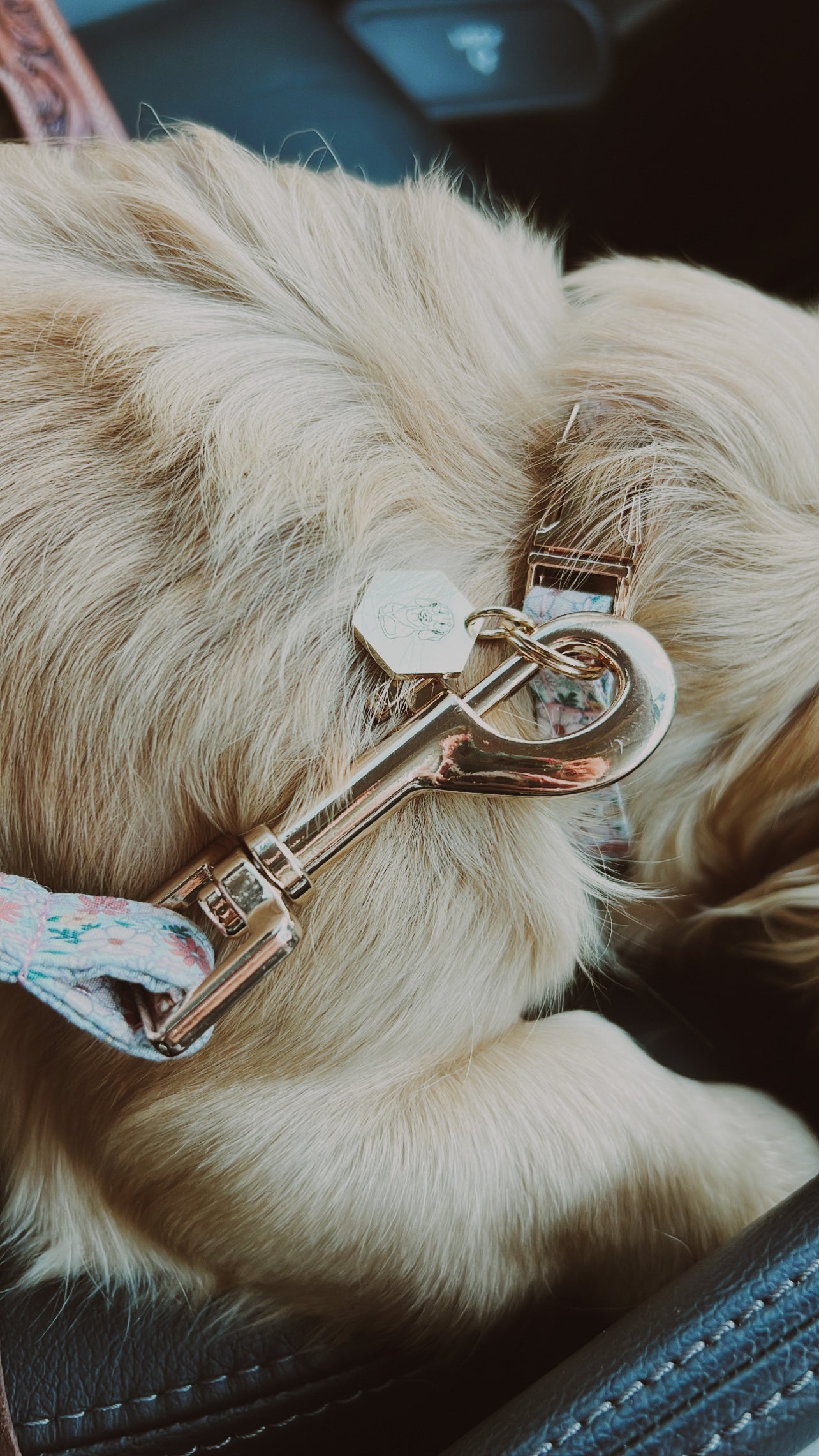 This beautiful floral print on cotton material with our sturdy gold hardware and stunning logo tags. Soon to be available in most sizes. This comes as a set with collar and lead set.